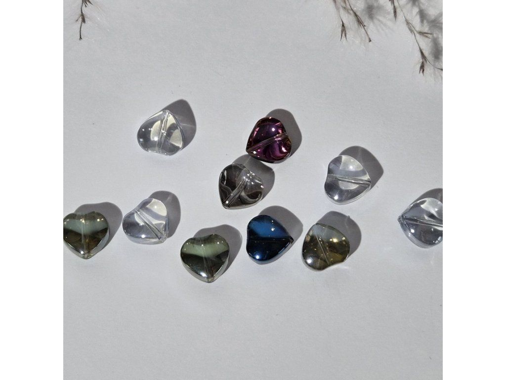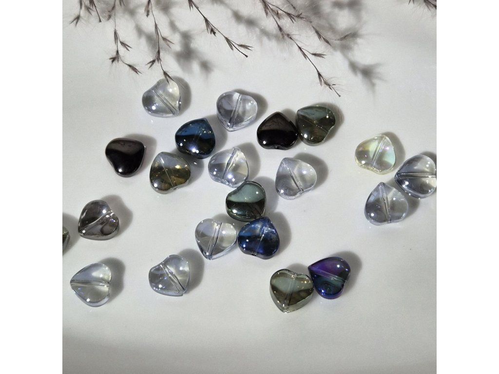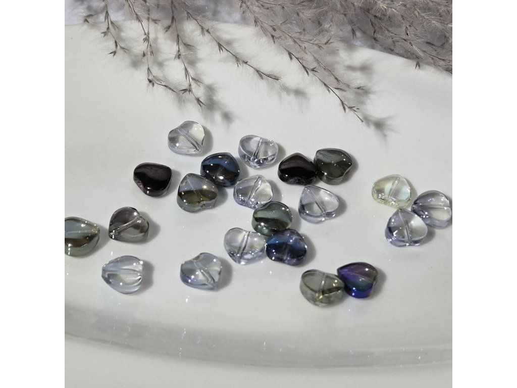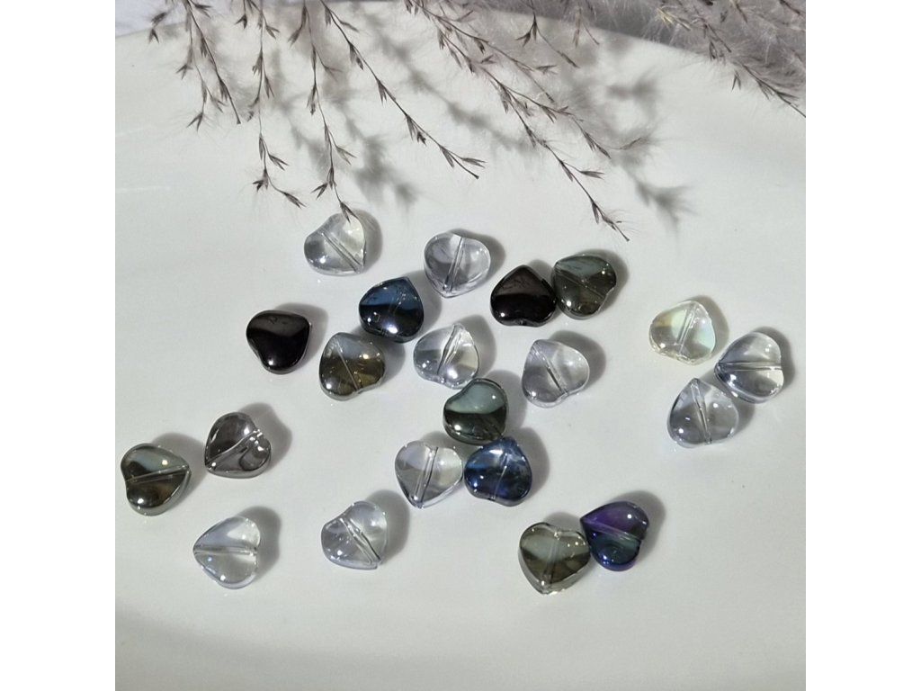 Elegantní skleněné korálky ve tvaru srdce v jemných kouřových a duhových odstínech. Díky částečné průhlednosti a lesklému povrchu krásně pracují se světlem a působí luxusně a moderně.