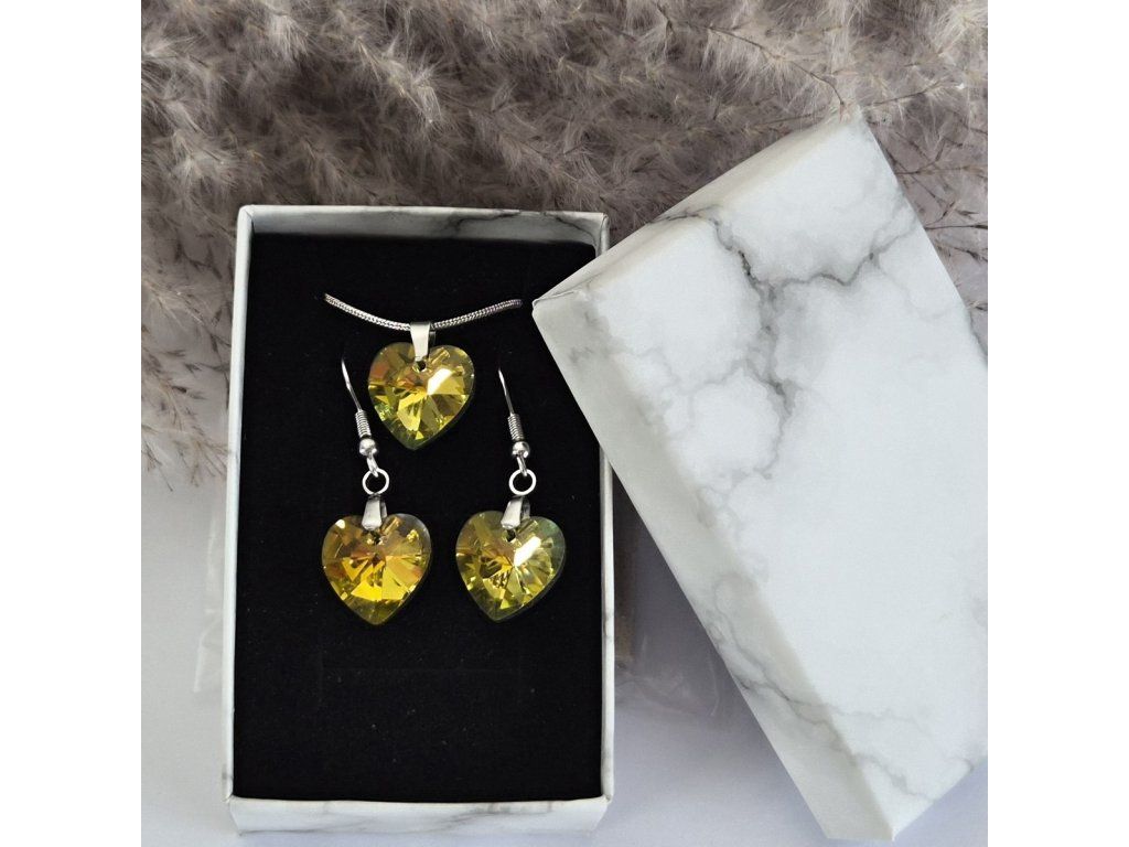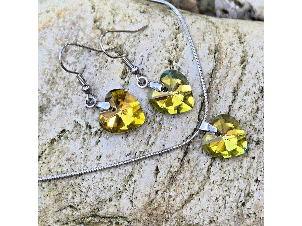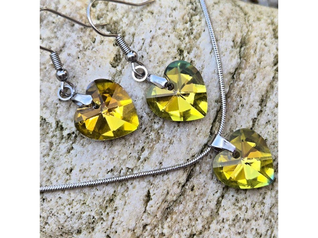 Elegantní šperková sada s krystalovým srdcem ve žluto-zlaté barvě, která zaujme svým intenzivním leskem a krásnými světelnými odlesky. Precizně broušený krystal vytváří efekt třpytivých paprsků, díky kterým šperk působí luxusně, svěže a velmi ženským dojmem.