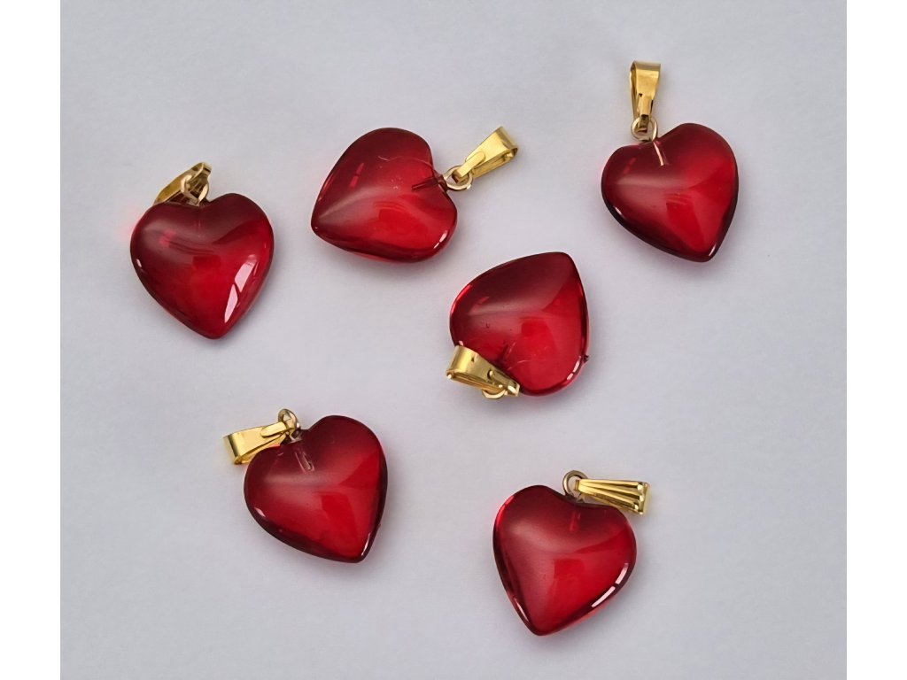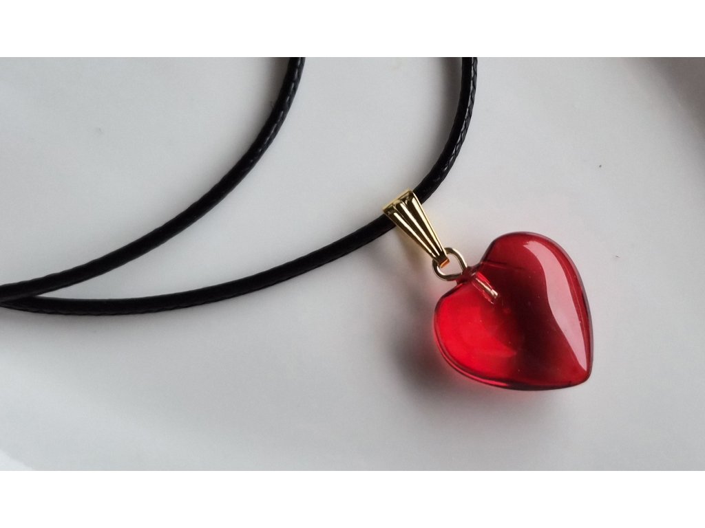 Červený skleněný přívěsek ve tvaru srdce na černé šňůrce. Velikost 1,5 x 1,7 cm