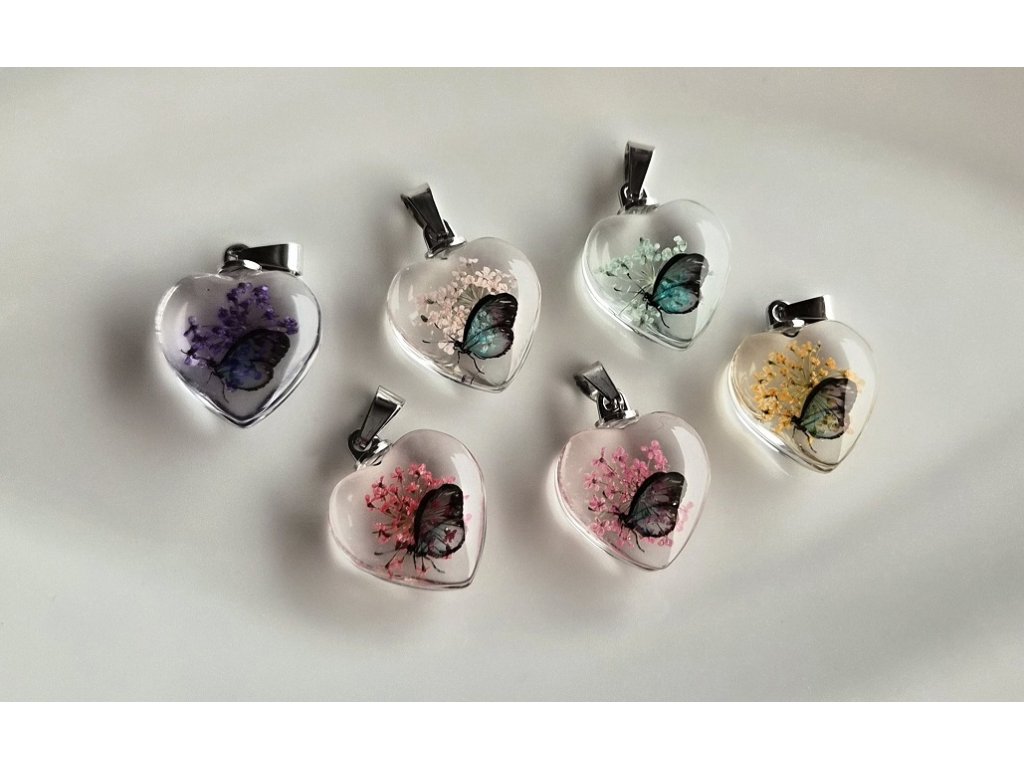 Přívěsek ve tvaru srdce z pryskyřice s motivem motýla a barevných květin o velikosti 2,49 cm.