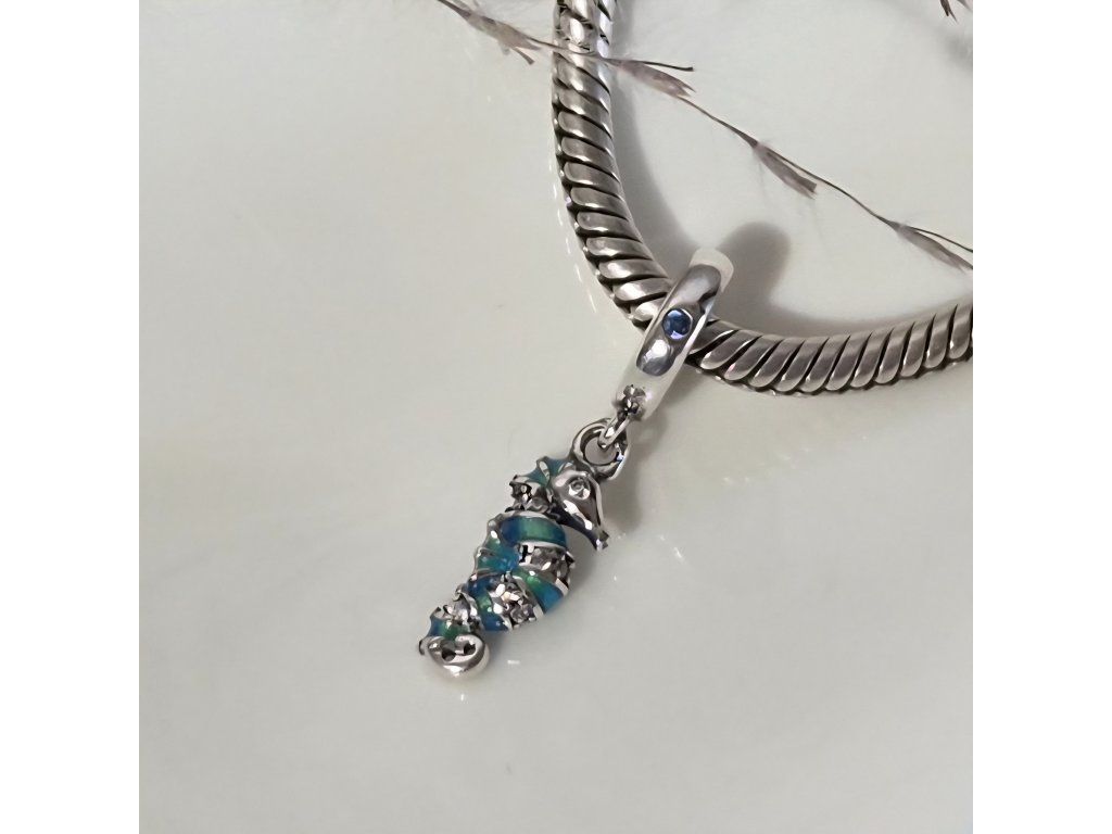 Jemný a detailně zpracovaný přívěsek ve tvaru mořského koníka přináší do vašeho šperku nádech oceánu, svobody a elegance. Kombinace lesklého stříbra S925, tyrkysových detailů a drobných třpytivých kamínků vytváří jedinečný design, který okamžitě upoutá pozornost.