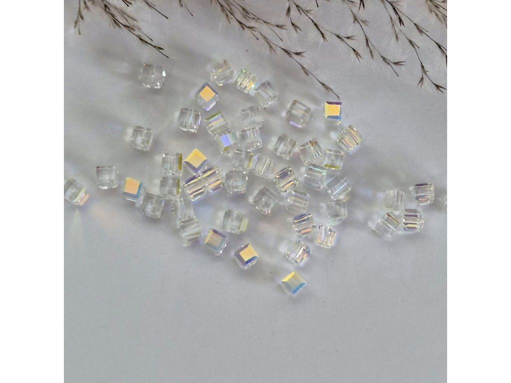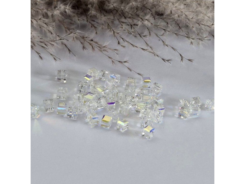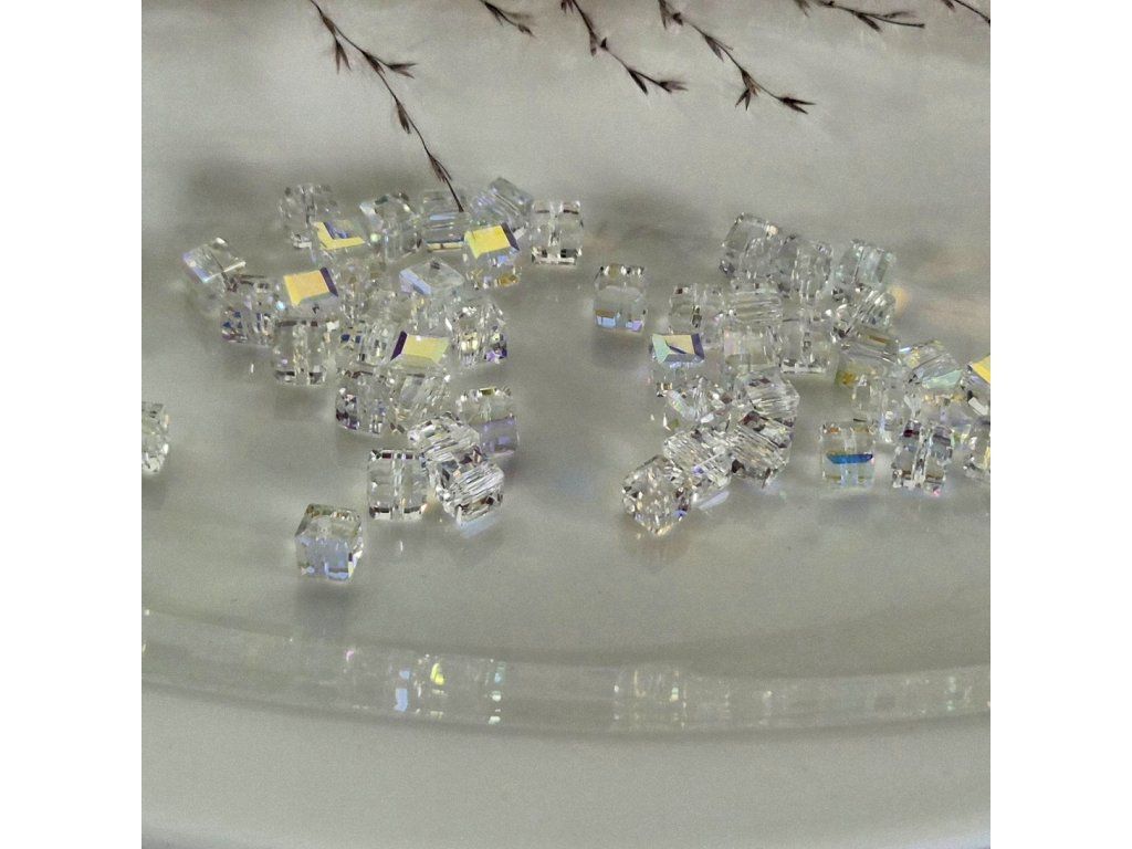 Dekorativní umělé křišťálové korálky ve tvaru kostky s krásným AB (Aurora Borealis) efektem, který vytváří duhové odlesky při dopadu světla. Díky preciznímu broušení mají korálky výrazný třpyt a elegantní vzhled podobný pravému křišťálu.