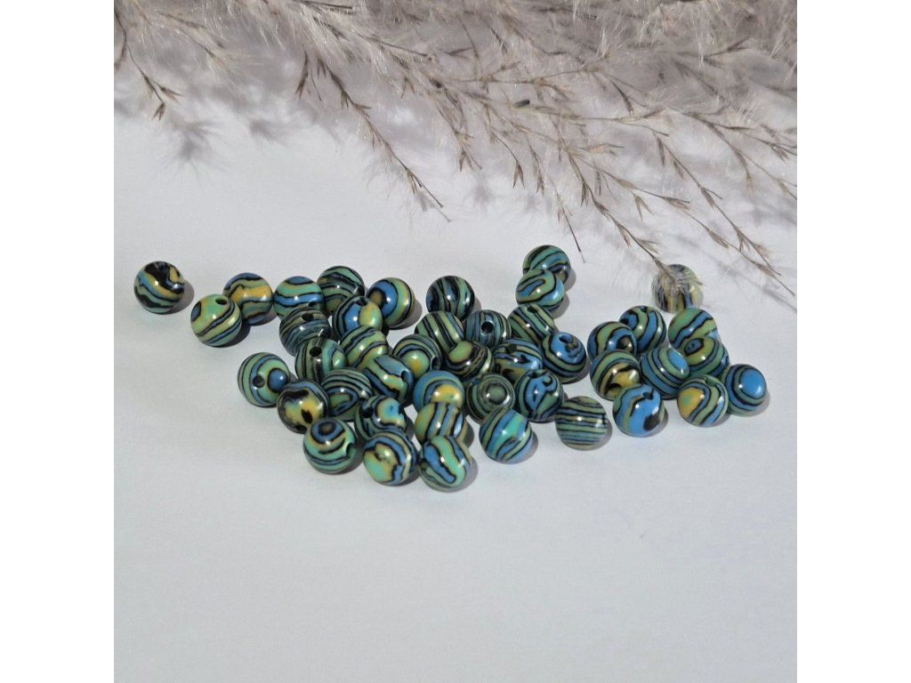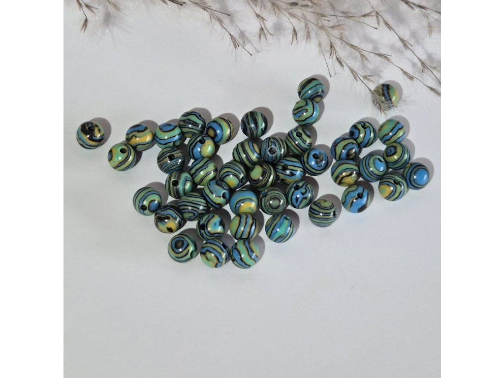 Dekorativní korálky inspirované přírodním malachitem v atraktivní kombinaci zelené, tyrkysové a modré barvy s typickým pruhovaným vzorem. Výrazné linie a kruhové struktury vytváří jedinečný efekt připomínající přírodní kresbu minerálu. Lesklý povrch zvýrazňuje hloubku barev a dodává korálkům elegantní vzhled.